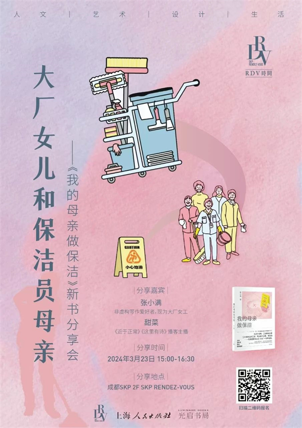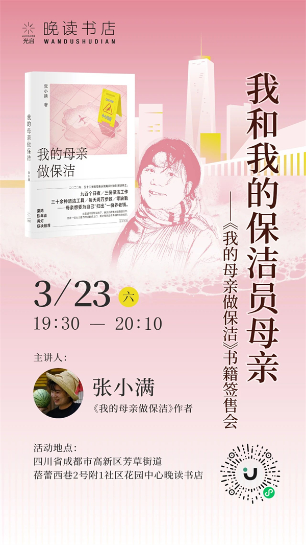 3月24日,《我的母亲做保洁》作者张小满将做客文轩BOOKS高新店,与读者分享她和她的保洁员母亲的故事,以及超级城市“漂一族”的生活现状。