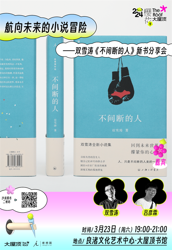 3月23日晚,双雪涛将携带新书《不间断的人》做客大屋顶,和青年学者吕彦霖一起,聊聊《不间断的人》中的故事,也探讨在AI世代小说这种文体的可能性。