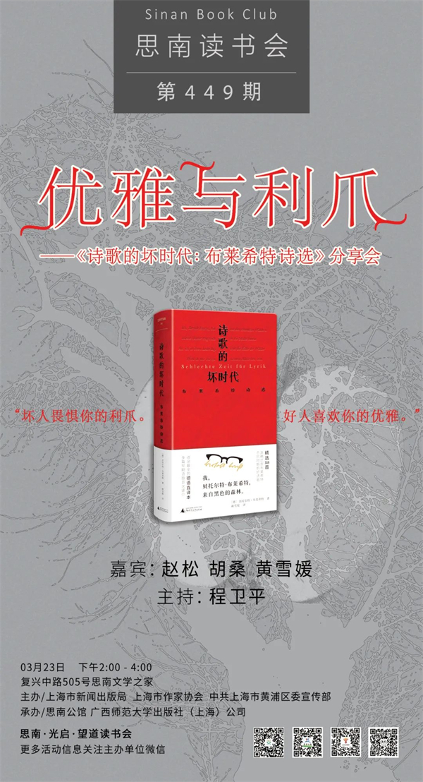 “坏人畏惧你的利爪。好人喜欢你的优雅。”布莱希特曾希望别人如此评价自己的诗句。布莱希特诗歌新译本——《诗歌的坏时代:布莱希特诗选》,选自布莱希特人生各阶段的诗歌为我们全面呈现了诗人布莱希特风格多样的诗艺。3月23日下午,作家赵松、诗人胡桑和本书译者黄雪媛将做客思南文学之家,本书编辑程卫平将担任活动主持,和大家共谈作为诗人的布莱希特和他的诗歌艺术,共读他的优雅与利爪,他的幽暗与光明。