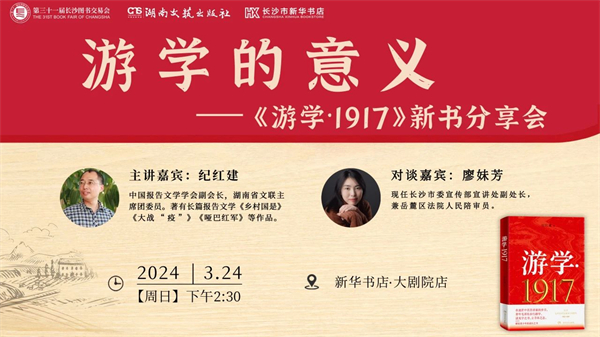 1917年7月中旬至8月16日,尚在湖南第一师范求学的青年毛泽东与萧子升步行漫游长沙、宁乡、安化、益阳、沅江五县,行程九百余里。他们如何与名流、农民、商人、手工业者、地方官吏等方方面面的人打交道、了解社会现状的?真实的中国现状对他们有何触动?他们如何赓续文化和精神血脉,进而注入中华民族这一精神共同体并绵延至今?调查研究的真正价值是什么?这次游学对他们的人生产生了怎样的影响?周日下午在新华书店·湖南大剧院店,作家纪红建带着新作《游学·1917》与您一起走进历史现场,与百余年前青年学子的步行漫游之旅交织、对话、共振,将相距百余年、两个完全不同的时代构建起某种内在联系,更深入他们的心灵,探寻他们游学对当代人尤其是青少年的启示意义。