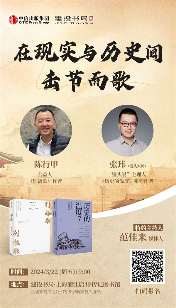 3月22日晚,中信出版集团联合建投书局邀请公益人、《别离歌》作者陈行甲和“馒头说”主理人、《历史的温度》系列作者张玮(馒头大师),为我们讲述他们在写作和人生中的思考与感悟。