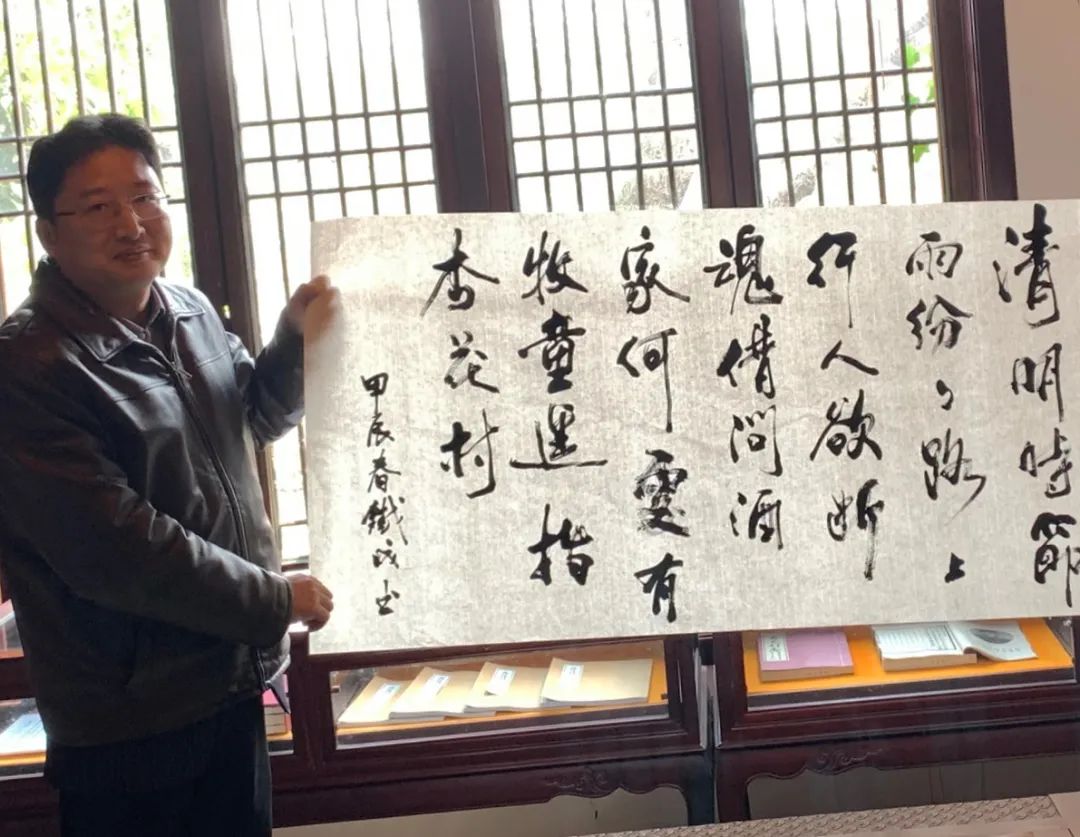 在杏花村一处书房内,看到文房四宝皆备,顿时兴起,注墨调锋,写了杜牧的清明诗,当即被“村长”收藏,也是缘。