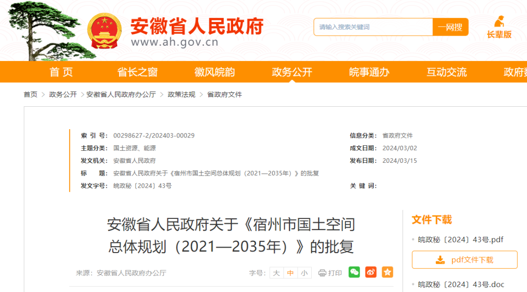《关于报请批准〈宿州市国土空间总体规划(2021—2035年)〉的请示》收悉。现批复如下: