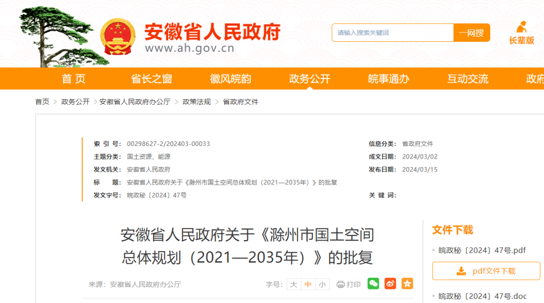 《关于报请批准〈滁州市国土空间总体规划(2021—2035年)〉的请示》收悉。现批复如下: