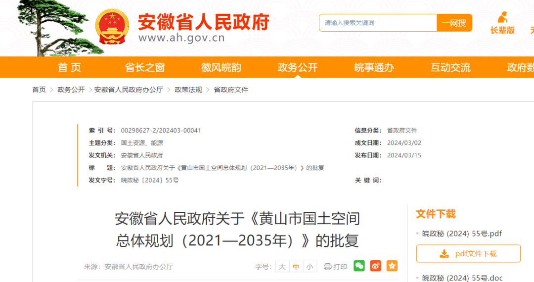《关于报请批准〈黄山市国土空间总体规划(2021—2035年)〉的请示》收悉。现批复如下: