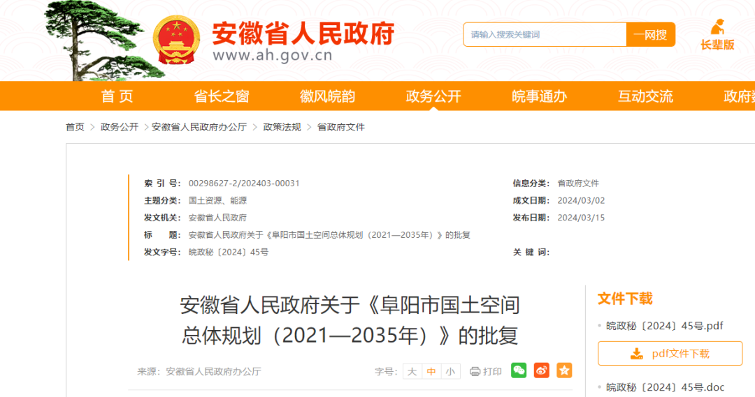 《关于报请批准〈阜阳市国土空间总体规划(2021—2035年)〉的请示》收悉。现批复如下: