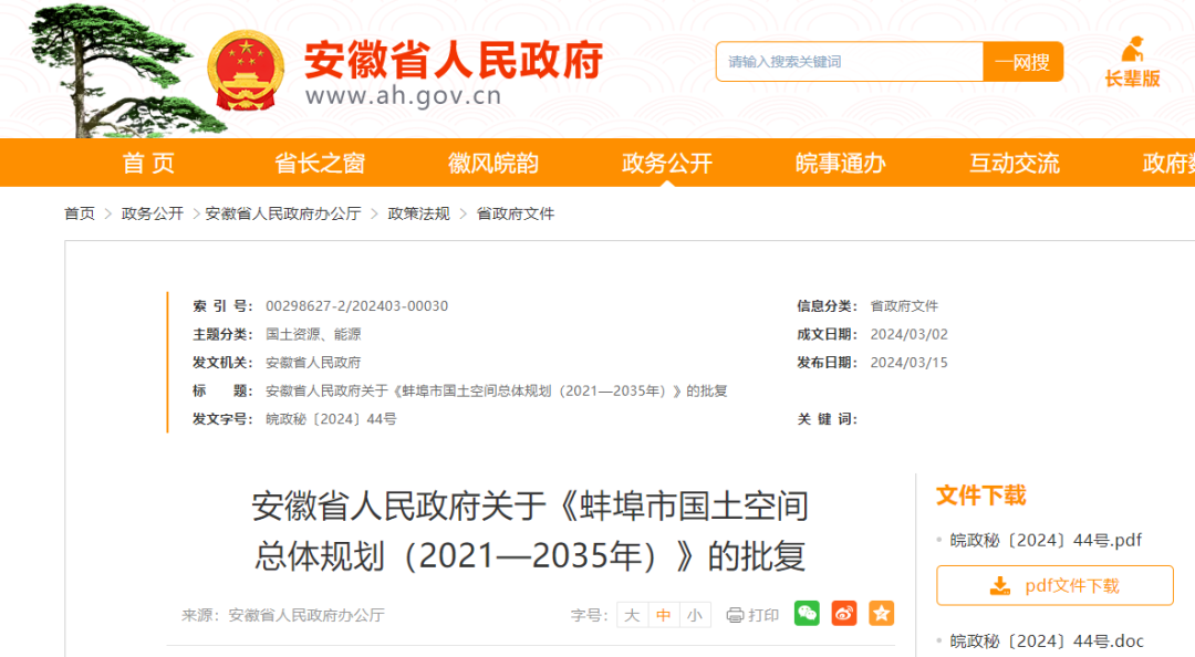 《关于报请批准〈蚌埠市国土空间总体规划(2021—2035年)〉的请示》收悉。现批复如下:
