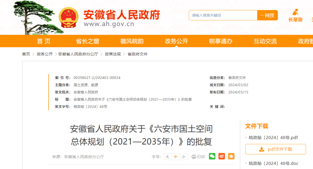 《关于报请批准〈六安市国土空间总体规划(2021—2035年)〉的请示》收悉。现批复如下: