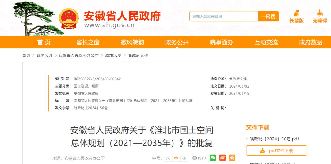 《关于报请批准〈淮北市国土空间总体规划(2021—2035年)〉的请示》收悉。现批复如下: