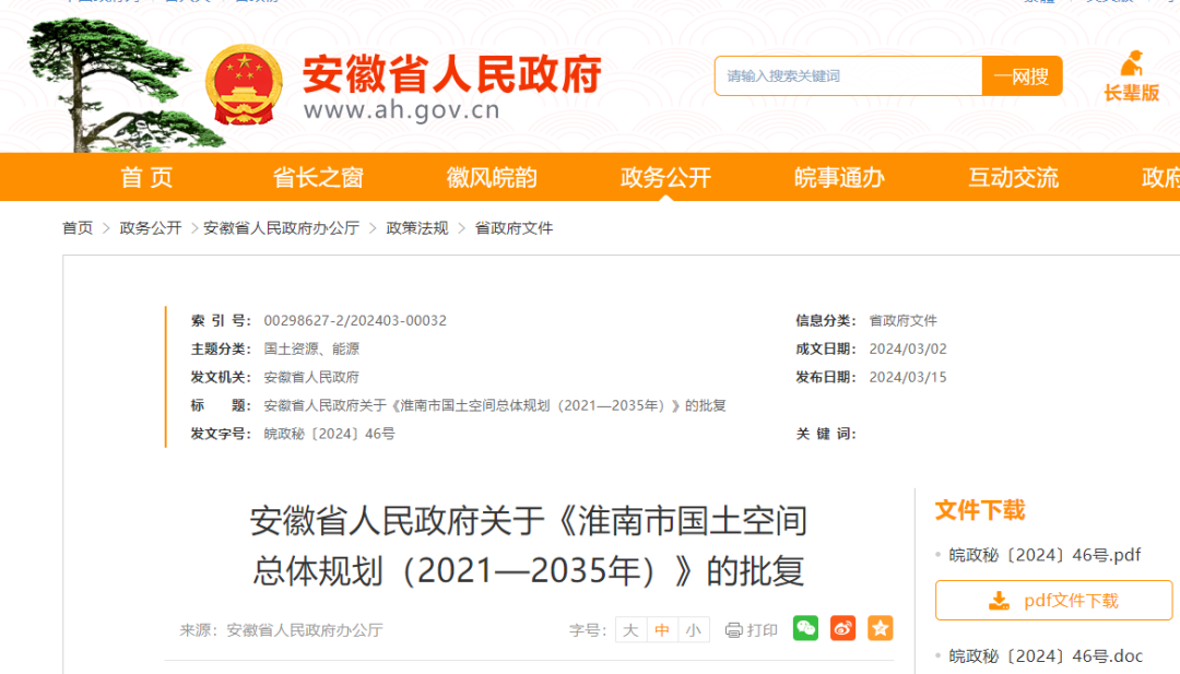 《关于报请批准〈淮南市国土空间总体规划(2021—2035年)〉的请示》收悉。现批复如下:
