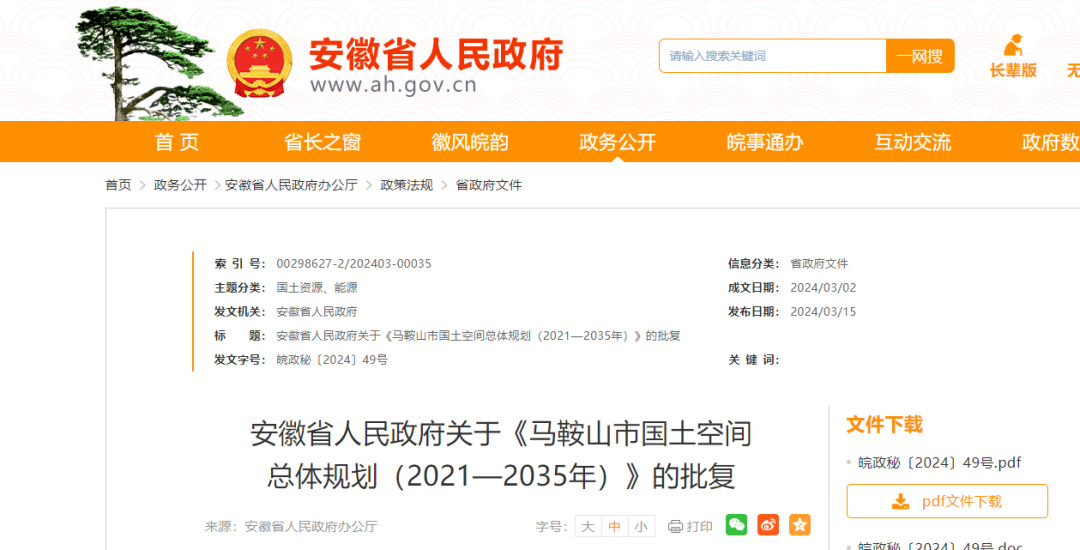《关于报请批准〈马鞍山市国土空间总体规划(2021—2035年)〉的请示》收悉。现批复如下: