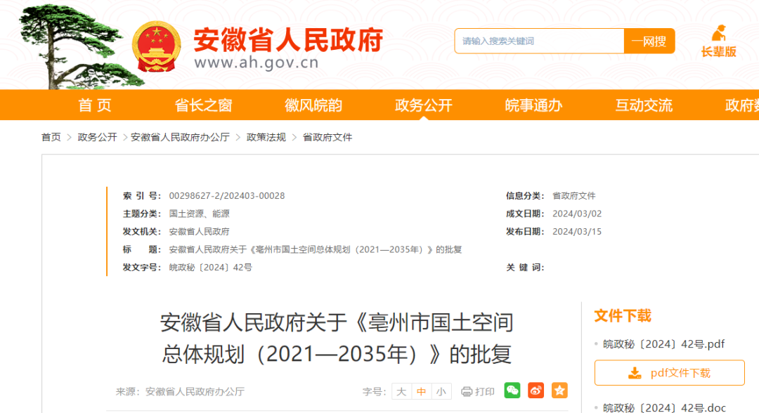 《关于报请批准〈亳州市国土空间总体规划(2021—2035年)〉的请示》收悉。现批复如下: