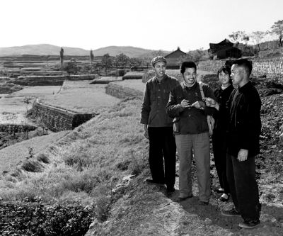 1973年,原邵东县委书记刘中心(左二)在火厂坪公社龙兴大队听石山造田情况介绍。(资料照片) 唐大柏 摄