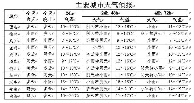 16日:陕北、关中北部多云间晴天,关中南部、陕南阴天,大部分地方有小雨,陕南南部有中雨。陕北北部日平均气温下降4℃左右。