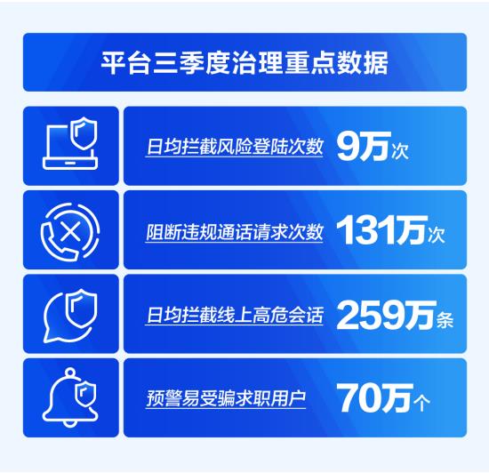 通过努力,今年第三季度,58同城已封禁违规招聘者账号超6.4万个,清除高危招聘帖超109万,58同城日均拦截风险登陆次数9万次,季度阻断违规通话请求次数131万次,日均拦截线上高危会话259万条,预警易受骗求职者70万个。