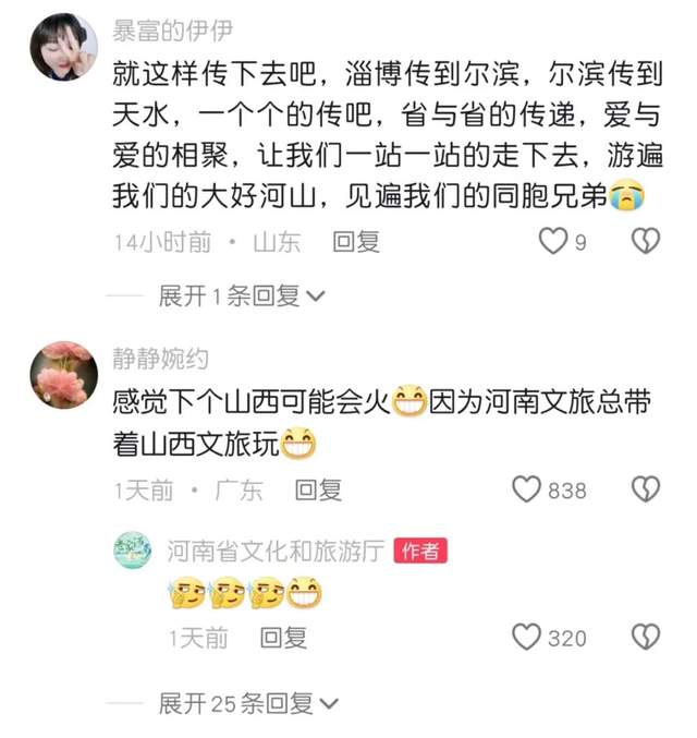有网友为河南文旅的大气格局点赞:“就这样传下去吧,省与省的传递,爱与爱的相聚,让我们一站一站地走下去,游遍我们的大好河山,见遍我们的同胞兄弟。”