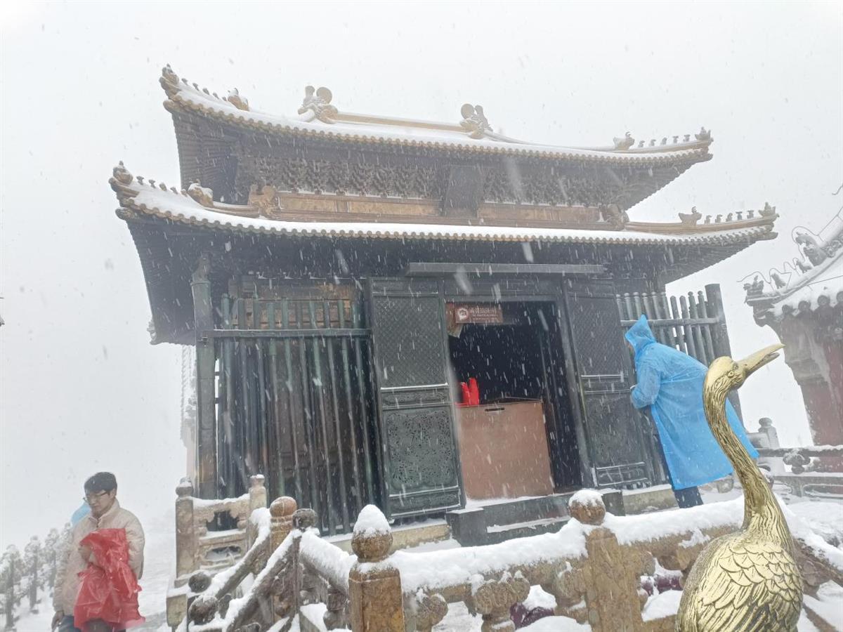据悉,3月18日早上,金顶景区的气温低至-5℃,积雪厚度达到10cm。皑皑白雪随风起舞,轻盈地落在枝头、山间、古建筑的檐角上,云雾在林间缭绕,武当山在雪的映衬下显得更加银装素裹、亮丽清新,仿佛置身于仙境之中。