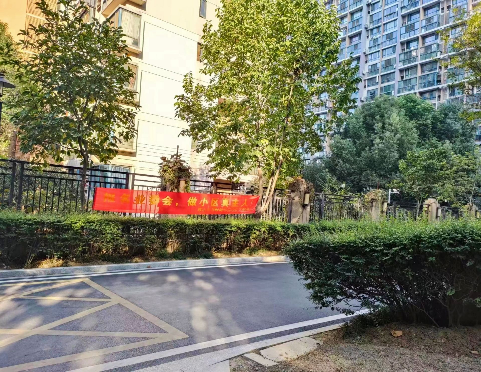 小区内打出“报名业委会,做小区真主人”的宣传横幅(受访者供图)