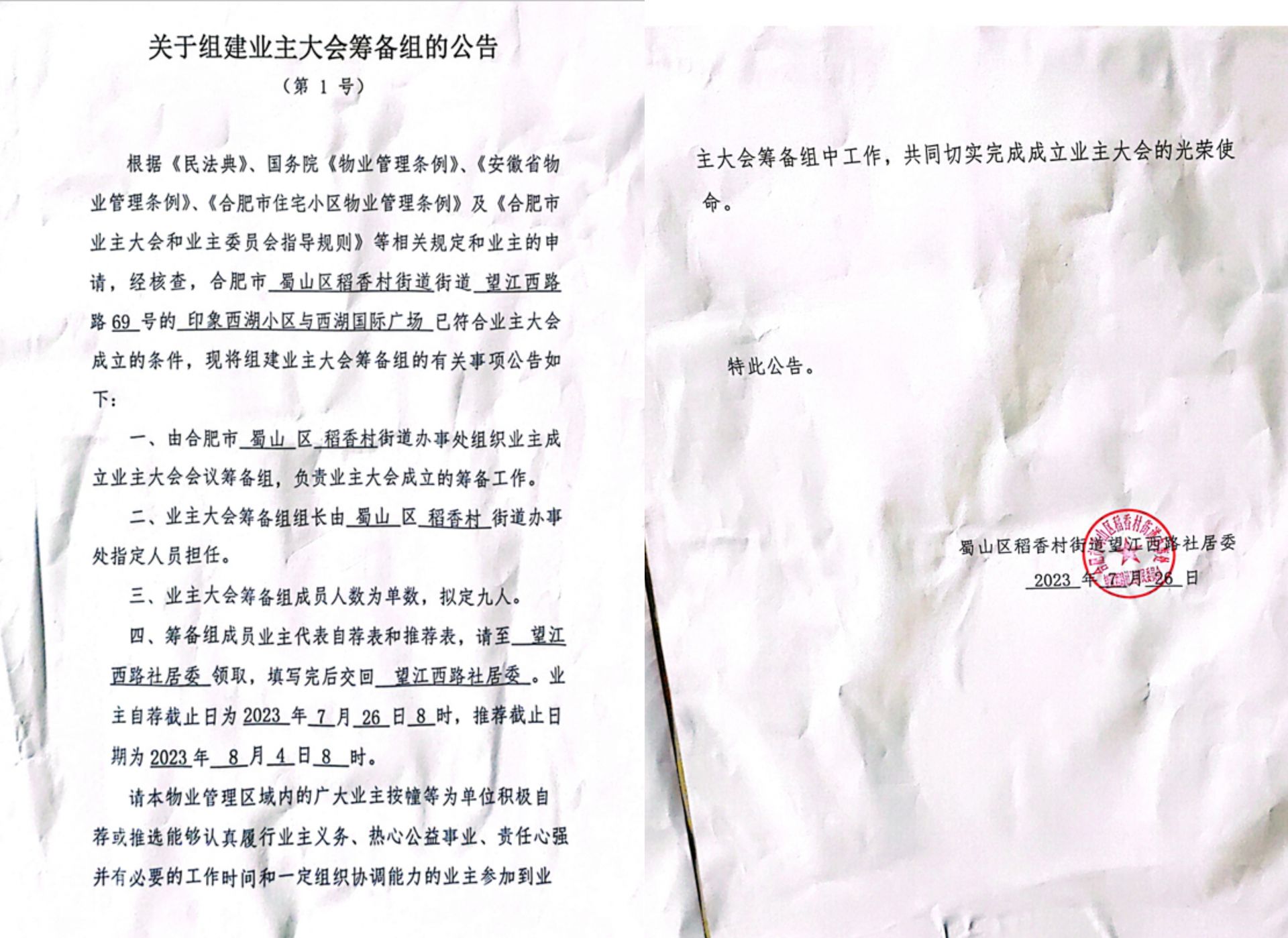 记者注意到,2023年7月26日,稻香村街道望江西路社居委发布《关于组建业主大会筹备组的第1号公告》称,经核查,印象西湖小区与西湖国际广场已符合业主大会成立的条件,并鼓励广大业主积极自荐或推选人员参加到业主大会筹备组中工作。