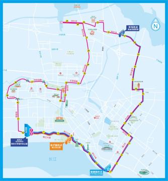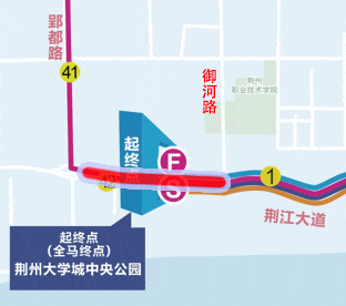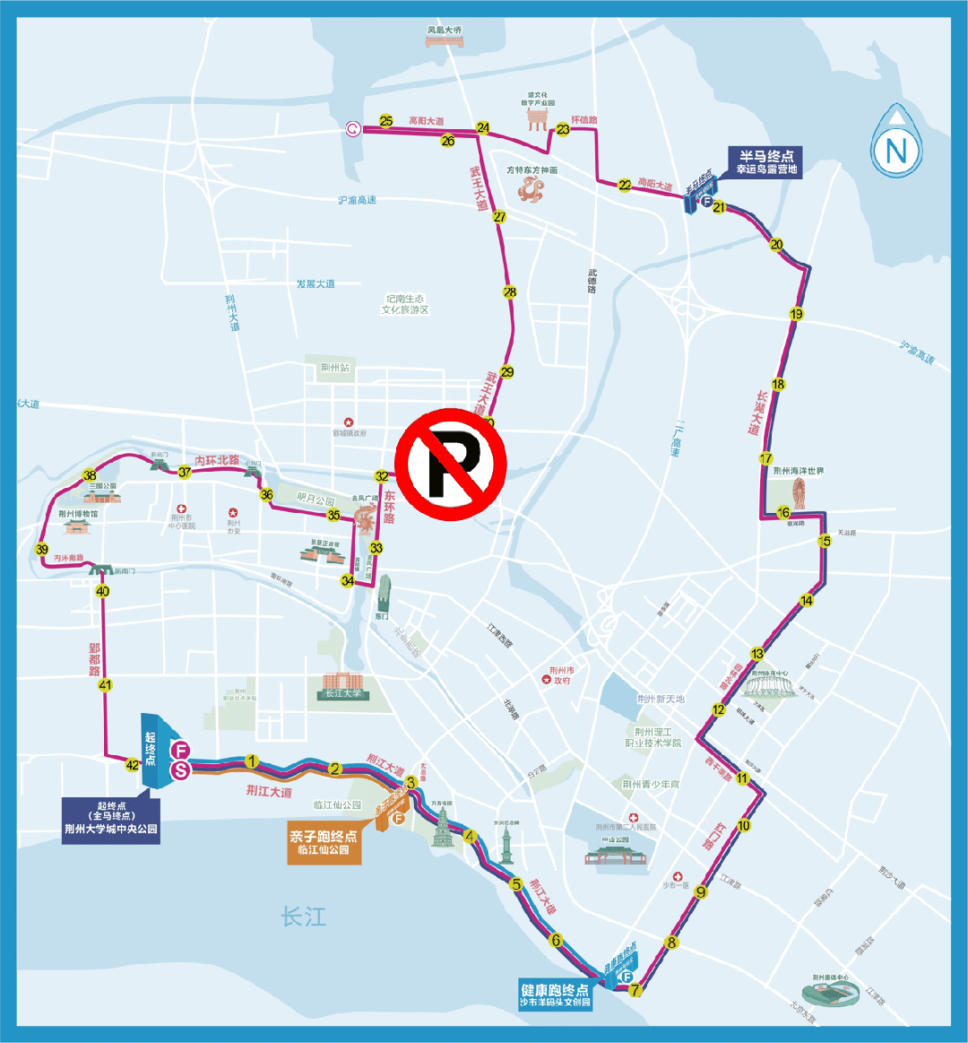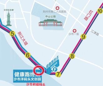 荆州大学城中央公园(起点)—荆江大道(太岳路右前方直行)—荆江大堤—沙市洋码头文创园(终点)。