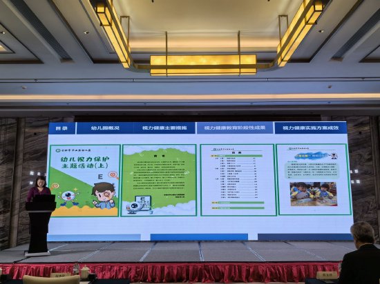 随后,来自全国7所中小学幼儿园代表进行了逐一汇报。司坤园长结合我园实际情况,从园所概况、视力健康实施措施、健康教育阶段性成果、实施方案成效四方面进行详细汇报,并对我园自主开发的幼儿视力保护主题活动课程及眼球操集的阶段性成果进行了推广。