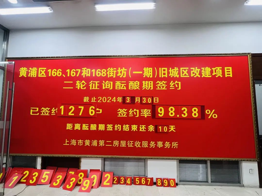 截至当晚12时,黄浦区166、167、168街坊(一期)二轮酝酿期首日签约率已达到98.38%,项目在酝酿期首日就实现了生效。