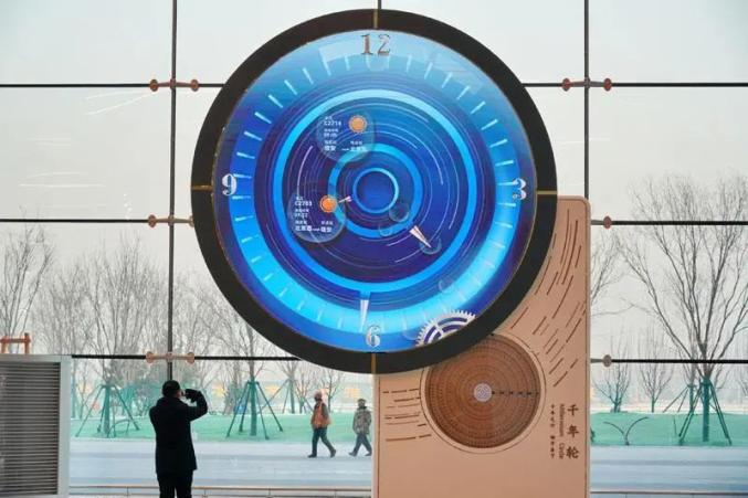 雄安新区雄安站候车厅,一座青铜轮盘吸引着往来旅客的目光。轮盘底座上,镌刻着它的名字——“千年轮”。