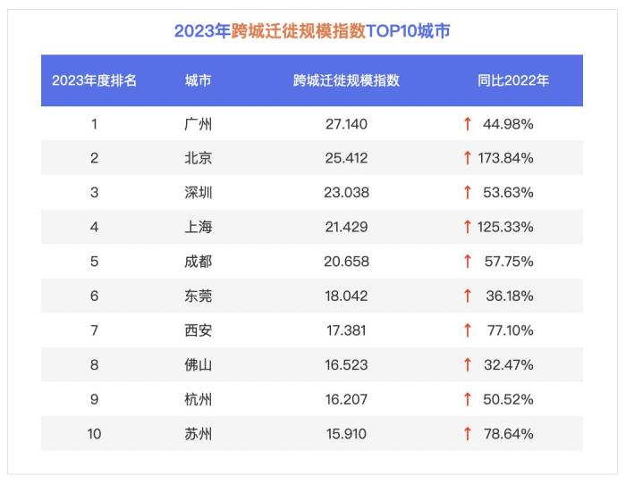 人口的流动与城市经济协同、交通基础设施发展密切相关。报告指出,2023年主要城市跨城迁徙规模均有所上涨。其中,珠三角居民跨城迁徙已成习惯,广州、深圳、东莞、佛山四地均跻身百城跨城迁徙规模前十榜单。珠三角便利的跨城交通出行是大湾区协同发展的重要成果。