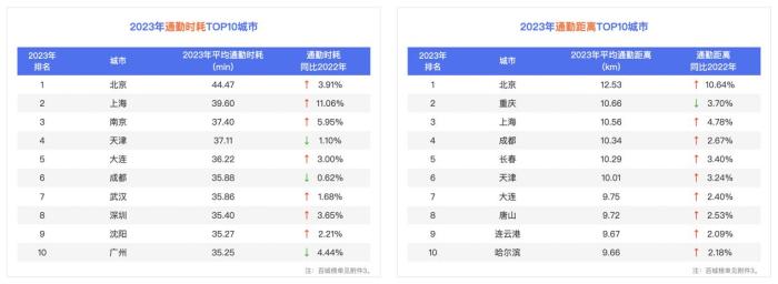 整体来看,2023年公众出行热度大幅上升、城市交通更为拥堵繁忙。报告显示:拥堵方面,百城中86%的城市通勤高峰交通拥堵指数同比上涨,北京与广州分列通勤高峰出行与周末出行的最堵城市,与此同时,宁波、金华等城市“降堵”成效明显;通勤方面,北京、上海、南京位列通勤时耗榜前三,北京、重庆、上海位列通勤距离榜前三;出行方面,百城跨城迁徙规模和市内出行强度都上涨了,百城跨城迁徙规模同比涨幅均值更是高达66%;报告还首次发布城市红绿灯通行幸福度榜单,大连、青岛位居该榜单前列。