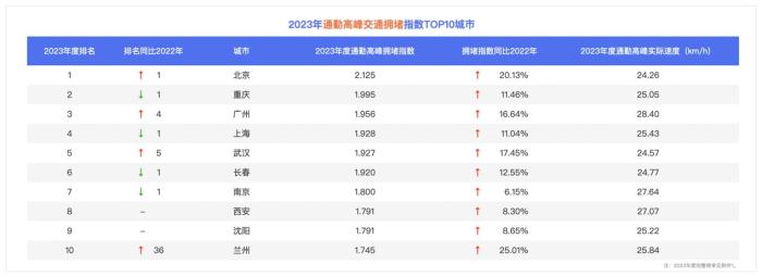 通勤高峰拥堵指数是反映工作日早晚高峰时段城市交通拥堵状况的重要指标。报告显示,北京的通勤高峰拥堵排名相较2022年上升一位、超过重庆,成为百城第一。另外,通勤高峰拥堵榜前十城市的拥堵指数同比2022年均上涨了,其中,兰州的拥堵指数同比涨幅最大,交通压力较大。