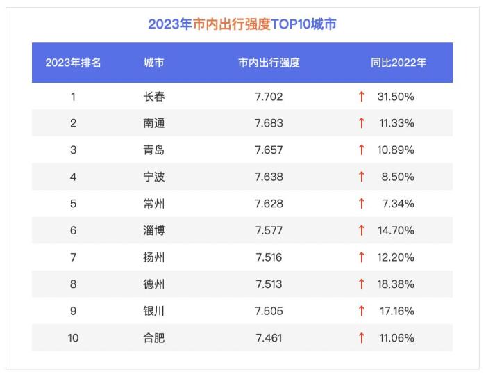 报告使用市内出行强度,即有市内出行行为的人数与居住人口比值的指数化结果,反应城市内部的出行活力。报告显示,长春位列市内出行榜百城第一,同比增长超三成。南通、青岛、宁波等地方经济“优等生”的市内出行强度也稳步上升,排名靠前。