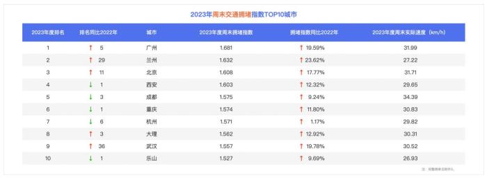 周末拥堵榜中,2023年广州的周末拥堵指数同比上升19.59%,排名提升五位,跃居百城第一。北京则让位广州、兰州,位列百城第三。同时,大理、乐山等旅游城市也跻身周末拥堵榜前十。