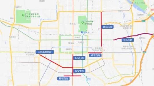 未央路、长安路、西影路、雁塔北路、西沣路、环城南路、二环(金光门至长安路立交、雁塔立交至太乙立交)、曲江大道、小寨东路、西大街、钟楼盘道、咸宁西路、雁翔路、曲江周边、关中环线等。