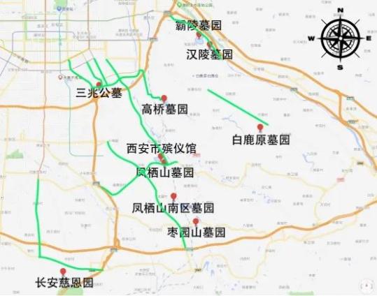 三兆墓园、霸陵墓园、汉陵墓园、高桥墓园、白鹿原墓园、西安市殡仪馆、凤栖山墓园、凤栖山南区墓园、枣园山墓园、长安慈恩园周边区域——