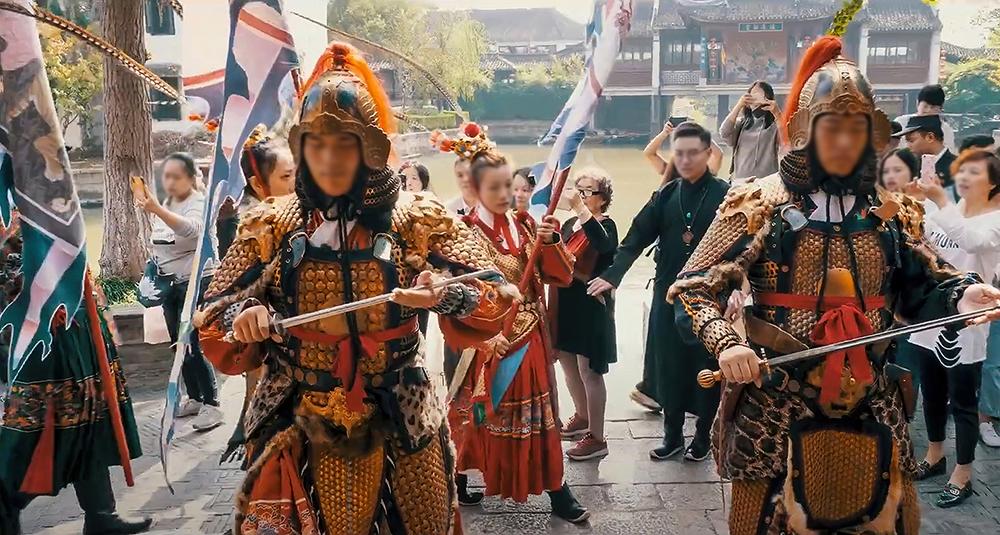 西塘的秀场也不仅限于服饰。穿着各朝官服、道袍、戎装、盛装而来的同袍在展示的时候就化身为了这身衣服所代表的人,他们执着与身份相符的礼仪向观众致意。