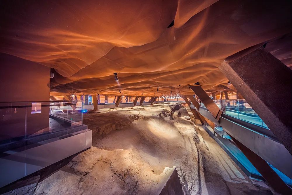 复建项目给遗址罩了一个保护罩,在保护罩上方再行复建,避免风吹日晒雨淋对文物的破坏;保护罩下建造承台供游客行进,减少对遗址层的干扰,同时给游客一个获取历史文物知识的空间。