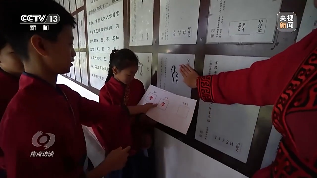 在河南安阳殷墟景区,15名小学生开启了主题为“解读中华民族文字密码”的研学之旅,这也是景区今年的第257期研学课。第一堂课,名为“文字对对碰”,在老师的启发下,孩子们根据甲骨文的形态猜对应的汉字,让他们对古老的甲骨文有一个直观的第一印象。