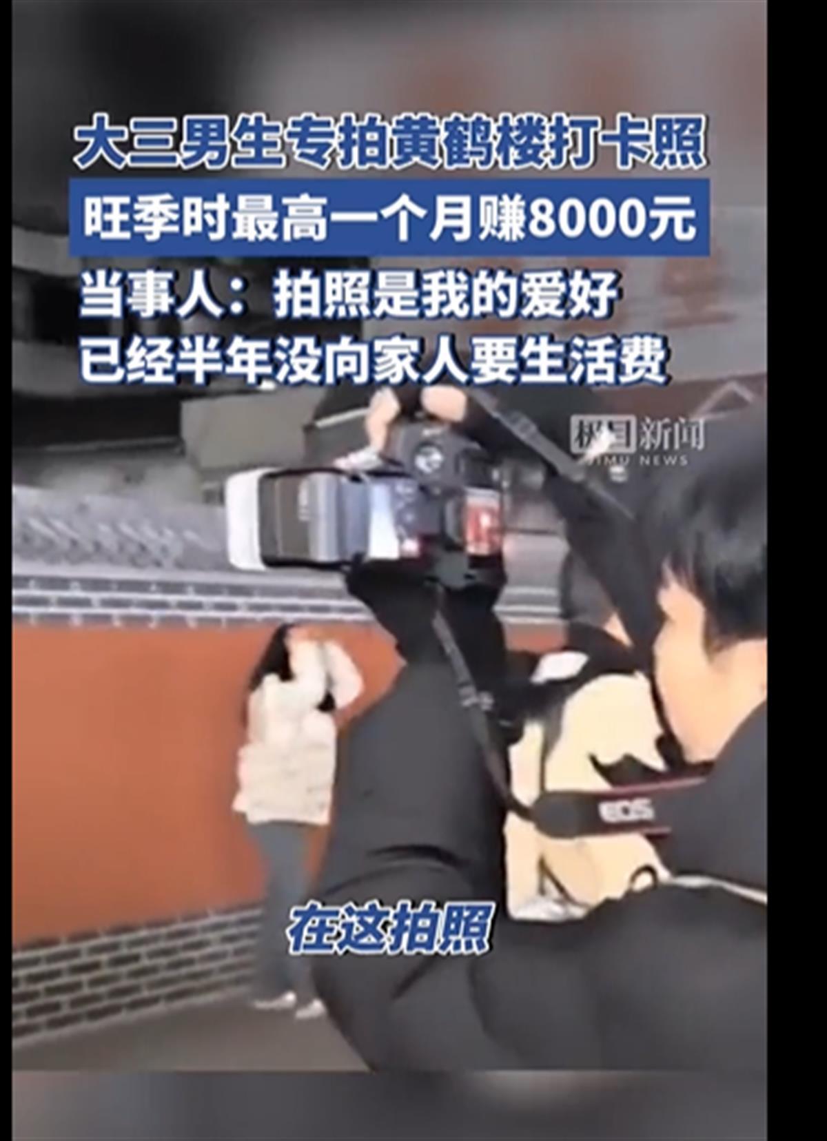 不少摄影师也捕捉到了这一商机,在黄鹤楼红墙前开启了商业拍照模式,普通直出照片收费10元一张,精修照片收费30元一张。生意最好时,一天能拍上百单,赚到数千元。“大三男生黄鹤楼摆摊拍照月赚8000元”,也就不算稀奇的了,还有比他赚得更多的。