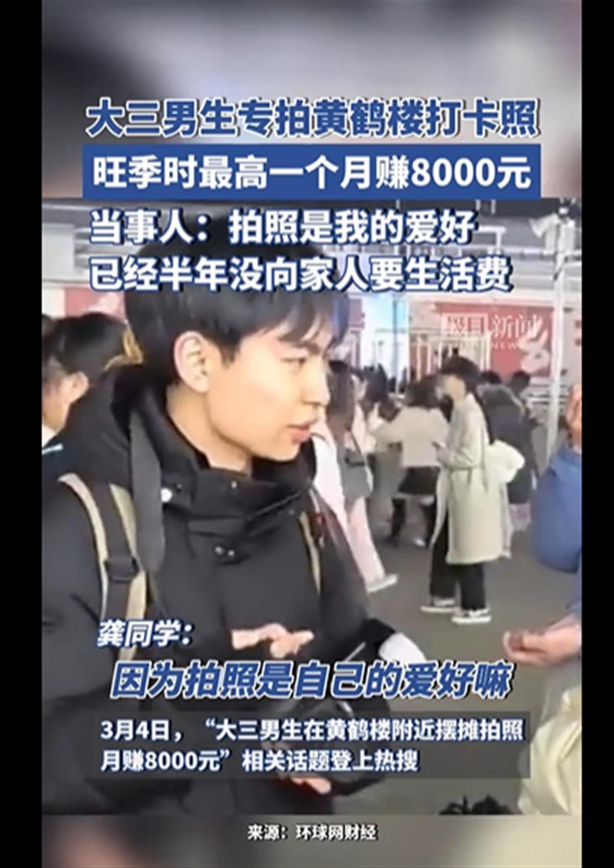 3月4日,“大三男生黄鹤楼摆摊拍照月赚8000元”相关话题冲上热搜。2003年出生,学护理专业的龚同学在武汉市武昌区司门口地铁口,做摄影师给游客拍打卡黄鹤楼的照片。龚同学表示,自己在这里拍照有半年的时间了,旺季的时候最高一个月能有七八千元的收入,因为做这个实现了经济独立,半年没向家里要生活费,实现了用爱好养活自己。(据3月4日极目新闻)