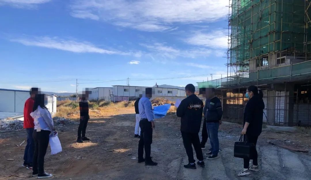 图九:案件承办团队在施工现场。该案涉案标的1.8亿元,为江川区法院建院以来标的最大案件,在承办团队施工现场调解、微信建群调解、电话调解、法庭调解的努力下,最终双方当事人握手言和。