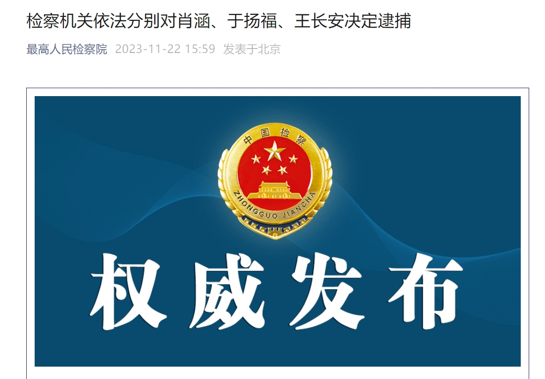 据最高人民检察院官微11月22日消息,检察机关依法分别对肖涵、于扬福、王长安决定逮捕,三人均涉嫌受贿罪。