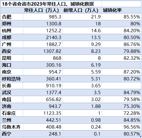 2023年,成都和郑州城镇化率突破80%,分别达到80.5%和80%,分别较上一年增长0.61和0.6个百分点。在18个省会中,有13个城市城镇化率超过80%。另外,西安去年城镇化率79.88%,南昌城镇化率79.58%,都已经逼近80%。