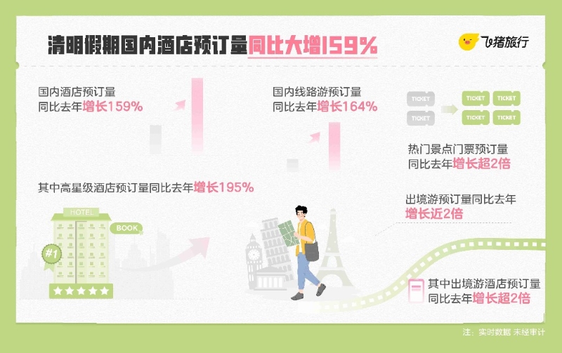 2024年清明假期出行热度再创新高。4月6日,飞猪发布的《2024清明假期出游快报》显示,清明假期国内酒店预订量较去年同期增长159%,线路游预订量增长164%,热门景点门票预订量增长超2倍。此外,返乡祭扫、返乡探亲的火车票预订量也同比去年增长近2倍。