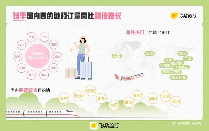 飞猪数据显示,今年清明假期,国内有超过一半目的地城市的旅游预订量同比去年翻倍增长,杭州、上海、广州、成都、北京、南京、重庆、武汉、苏州、西安等是假期国内热门目的地。从增速来看,天水、汉中、大同、宣城、漳州、洛阳、景德镇、宝鸡、泰安、湖州等目的地增速较快。值得一提的是,无论是总量还是增速,中西部旅游城市的占比均显著增加。