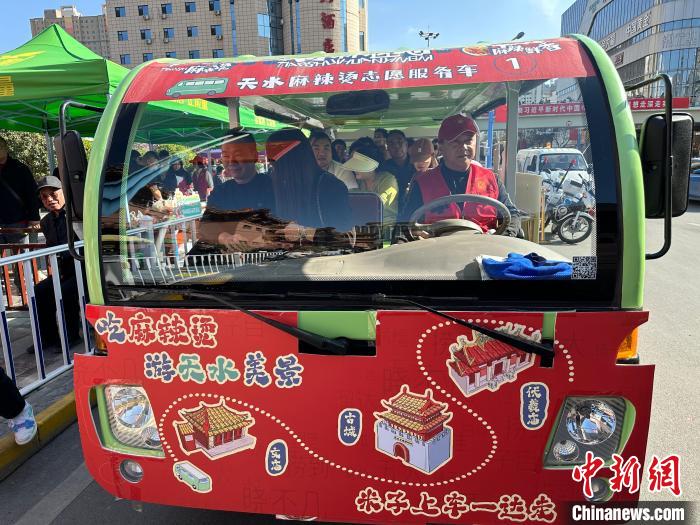 3月25日,游客在乘坐天水麻辣烫志愿服务车。 戴文昌 摄