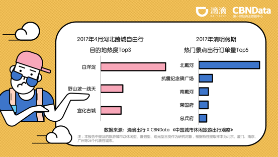 雄安新区的建立带动了京津冀自由行的出行订单量,让京津冀旅游在今年清明小长假迎来小高峰。《观察》中滴滴出行大数据显示,2017年4月,河北跨城自由行热门目的地为雄安核心景点以及周边景点,其中白洋淀景区成为黑马,旅游人数今年呈井喷式增长。此外,北京至秦皇岛一线成为京津冀地区滴滴顺风车最火的线路。