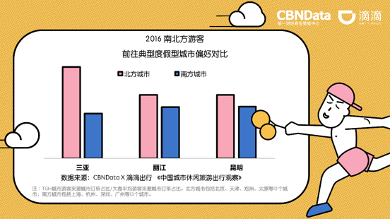 此外,在旅游这件事情上,南北差异明显,由于城市群交通的便利,南方的朋友偏爱在城市周边游,而北方的朋友则喜欢到南方体验不一样的文化,以前往亚热带和热带城市三亚、丽江和昆明为首选。
