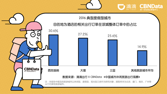 每逢节假日,度假成为当下都市人解压娱乐的方式之一,若干小长假则让国内的度假游掀起了一波波热潮。通过对旅游城市终点为酒店的出行订单观察发现,热门度假胜地中西双版纳、三亚、大理无疑成为典型的度假型城市,而最受北方游客喜爱的度假型城市为三亚、丽江和昆明。