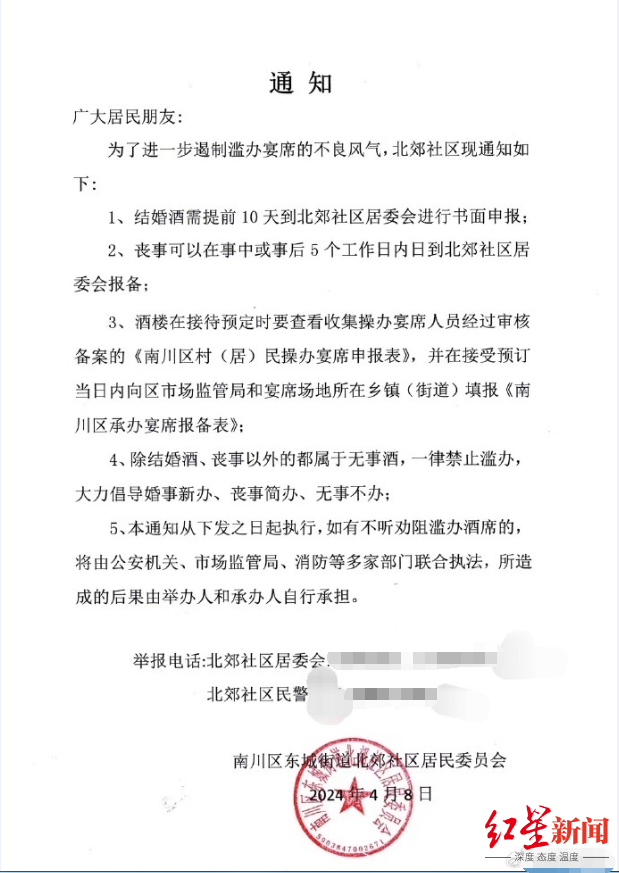 南川区南城街道南园路社区工作人员称,社区也发布了类似的通知,从4月1日起开始执行。该工作人员表示,结婚办酒要提前报备且仅限于初婚,丧事可以在事后5天内到社区报备。“如果请客范围在8桌之内,且不收礼金的话,则算是家宴,不在范围内。像那种(办宴席)大张旗鼓,还要打个横幅,而且明确收取礼金的话,就肯定不行。”