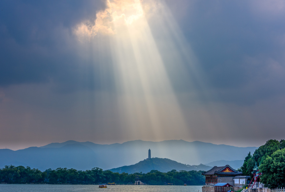 2022年7月26日,北京,雨后颐和园上空出现云隙光。